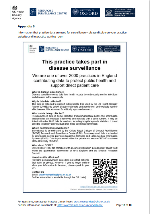 We are proud to be part of the National Programmes run by the Royal College of GPs, University of Oxford and University of Newcastle keeping an eye on infections in the community. These include taking swabs or a stool sample for infective diarrhoea. If appropriate, your clinician may ask you to take part which is entirely voluntary as with all studies.